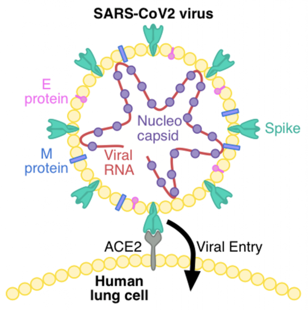 Lastly, the current virus. Wuhan’s pneumonia was officially named COVID19 and since it is the second strain of the SARS virus, it is called SARS-CoV-2. Understanding the biological structure of the SARS-CoV-2 answers a few key questions that I, myself, asked. When the virus was first discovered in 1965, scientists gave the name corona, which means ‘crown’ in Latin due to its unique form of spike proteins on the surface. Originally, only cold symptoms were displayed, however, SARS and MERS caused pneumonia, a disease known for its high fatality rate. SARS-CoV-2 is the most recently identified coronavirus strain, with its genetic structure similar up to 79.5% with the SARS virus and 96% identical with the bat’s coronavirus. The coronavirus is usually transmitted to the human body through oral mucous membranes and lungs, because of a receptor on the surface of the host cell named ACE2 (Angiotensin-Converting Enzyme 2) and spike proteins on the surface of the virus bind neatly to penetrate the human body. However, when they bind incorrectly, the virus will not be able to replicate, and the virus will die. ACE2 is an enzyme that attaches to the cell membrane of cells in the lungs, heart, kidney and intestines.